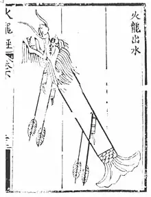 Evidence of gunpowder's first use in China comes from the Tang dynasty (618–907).[25] The earliest known recorded recipes for gunpowder were written by Zeng Gongliang, Ding Du and Yang Weide in the Wujing Zongyao, a military manuscript compiled in 1044 during the Song Dynasty (960–1279). Its gunpowder formulas describe the use of incendiary bombs launched from catapults, thrown down from defensive walls, or lowered down the wall by use of iron chains operated by a swape lever.[26][27][28] Bombs launched from trebuchet catapults mounted on forecastles of naval ships ensured the victory of Song over Jin forces at the Battle of Caishi in 1161, while the Mongol Yuan Dynasty (1271–1368) used gunpowder bombs during their failed invasion of Japan in 1274 and 1281.[27] During the 13th and 14th centuries, gunpowder formulas became more potent (with nitrate levels of up to 91%) and gunpowder weaponry more advanced and deadly, as evidenced in the Ming Dynasty (1368–1644) military manuscript Huolongjing compiled by Jiao Yu (fl. 14th to early 15th century) and Liu Bowen (1311–1375). It was completed in 1412, a long while after Liu's death, with a preface added by the Jiao in its Nanyang publication.[29]
