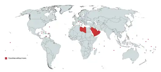 There are currently 20 countries and 22 territories that do not have a permanent natural river flowing within them, though some of them have streams or seasonal watercourses such as wadis.[1]