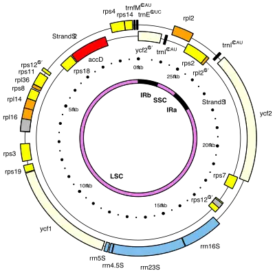 - 1 2 Moore MJ, Dhingra A, Soltis PS, Shaw R, Farmerie WG, Folta KM, Soltis DE (August 2006). "Rapid and accurate pyrosequencing of angiosperm plastid genomes". BMC Plant Biology. 6: 17. doi:10.1186/1471-2229-6-17. PMC 1564139. PMID 16934154.
