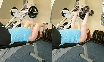 • The bench press or dumbbell bench-press is performed while lying face up on a bench, by pushing a weight away from the chest. This is a compound exercise that also involves the triceps and the front deltoids, also recruits the upper and lower back muscles, and traps. The bench press is the king of all upper body exercises and is one of the most popular chest exercises in the world. It is the final exercise in 'The big 3'.
