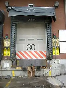 A loading dock or loading bay is an area of a building where goods vehicles (usually road or rail) are loaded and unloaded. They are commonly found on commercial and industrial buildings, and warehouses in particular. Loading docks may be exterior, flush with the building envelope, or fully enclosed. They are part of a facility's service or utility infrastructure, typically providing direct access to staging areas, storage rooms, and freight elevators.[1]