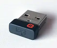 The Logitech Unifying Receiver is a small dedicated USB wireless receiver, based on the nRF24L-family of RF devices,[1] that allows up to six compatible Logitech human interface devices (such as mice, trackballs, touchpads, and keyboards; headphones are not compatible) to be linked to the same computer using 2.4 GHz band radio communication. Receivers that are bundled with a Logitech product are paired with the device at the factory. When purchasing a replacement receiver or connecting multiple devices to one receiver, pairing requires the free-of-charge Logitech Unifying software, available for Microsoft Windows and Mac OS X. On Linux the Solaar software can be used to adjust the configurations. Although not compatible with Bluetooth, devices pair to Unifying Receivers in a similar way.[2] Peripherals remain paired, and can then be used on systems not supporting the software. Logitech receivers compatible with the Unifying protocol can be identified by the orange Unifying logo, which distinguishes them from Logitech Nano receivers of similar appearance, which pair in a similar manner but only with a single device, without using the Unifying protocol.