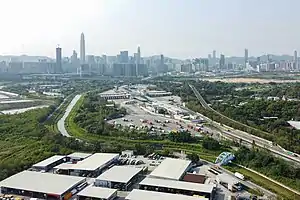 Lok Ma Chau Control Point, with the Shenzhen skyline in the background.