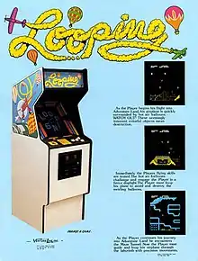 Looping was first released in arcades by Video Games GmbH in Europe and Venture Line in North America in March 1982.[7][10] The game was ported to ColecoVision by Nuvatec and published in 1983 by Coleco in North America and CBS Electronics in Europe.[1][4][11] The ColecoVision port was programmed by Ed English, as Giorgio Ugozzoli was not involved in the porting process.[1][8] An Atari 2600 conversion, programmed by subcontractor Ed Temple, was under development by Individeo and advertised but went unpublished until it was released as a limited run of 250 boxed copies at the 2003 Classic Gaming Expo.[5][12][13] An Intellivision version was planned as well but never released.[14] In 2011, the game's ROM image was made available as freeware with permission from Video Games GmbH founder Reinhard Stompe.[7][8]
