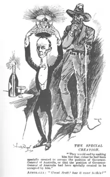 Other problems appeared with regard to the relationship between the new Governor-General and the continuing state governors. Disputes emerged between Hopetoun and several state governors—particularly South Australian governor Lord Tennyson, who would be Hopetoun's successor—over the Governor-General's right of access to dispatches and communiqués of the state governors. Questions of the independence of the states were raised and some fears of federal takeover of local affairs persisted during the disputes, until uneasy compromises were reached which saw some but not total subordination of state governors.[16] Hopetoun continued to struggle to diminish pre-existing local parochial sentiments within the states, though his position within the Commonwealth was much better publicised and secured after his co-ordination and hosting of the Royal Visit in 1901.[17] Tactful dealings with state governors and his strength at mediation helped secure that position in the early years of the Commonwealth as confidence in the new national entity was forged.