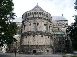 Seen from outside, the different elements of the building are clearly discernible as independent volumes, "as if they could be taken apart and put together again".[74] The apse of the cathedral is a "forcefully articulated" semi-circle.[31] Compared to its predecessors in Mainz, its composition is somewhat more elaborate with three distinct storeys each divided into fields, the lower by lesenes and the middle by columns with decorated capitals. The uppermost part is a gallery of shallow barrel vaults carried by 21 smaller columns, which open towards the exterior.[77] The apse is the most well-preserved part of the Romanesque building and has been described as "the artistic high point of the exterior".[78] The southern portal of the nave is perhaps the oldest of the cathedral. Five decorated archivolts supported by small columns with variously decorated capitals, frame a tympanon depicting the Lamb of God.[79] The northern portal is slightly later and more richly decorated. Its tympanon depicts Samson wrestling with the lion.[80] Two bronze doors built by Carl Johan Dyfverman serve as the main entrance in the centre of the west facade. They have 24 reliefs with subjects from the Bible, particularly the Old Testament. Above the doorway, the tympanon depicts Christ, Canute IV of Denmark and Saint Lawrence.[71] The cathedral has two sacristies.[4] The building material of the cathedral is mostly sandstone quarried in the area around Höör. The main walls are constructed as shells of sandstone filled with fieldstone mixed with lime mortar. The thickness of the walls is around 2 to 3 metres (6.6 to 9.8 ft).[4][81]