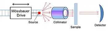 A Mössbauer spectrometer is a device that performs Mössbauer spectroscopy, or a device that uses the Mössbauer effect to determine the chemical environment of Mössbauer nuclei present in the sample. It is formed by three main parts; a source that moves back and forth to generate a Doppler effect, a collimator that filters out non-parallel gamma rays and a detector.