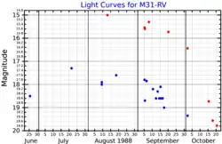 Light curves for M31-RV, adapted from Boschi and Munari (2004).[1] The red dots show the red band magnitude, and the blue dots show the blue band magnitude.