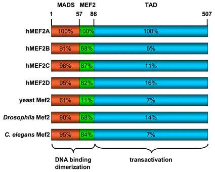 All of the mammalian Mef2 genes share approximately 50% overall amino acid identity and about 95% similarity throughout the highly conserved N-terminal MADS-box and Mef2 domains, however their sequences diverge in their C-terminal transactivation domain (see figure to the right).[5]