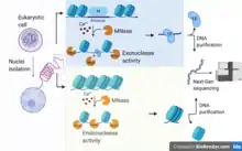 In a typical MNase-seq experiment, eukaryotic cell nuclei are first isolated from a tissue of interest. Then, MNase-seq uses the endo-exonuclease micrococcal nuclease to bind and cleave protein-unbound regions of DNA of eukaryotic chromatin, first cleaving and resecting one strand, then cleaving the antiparallel strand as well.[3] The chromatin can be optionally crosslinked with formaldehyde.[44] MNase requires Ca2+ as a cofactor, typically with a final concentration of 1mM.[5][12] If a region of DNA is bound by the nucleosome core (i.e. histones) or other chromatin-bound proteins (e.g. transcription factors), then MNase is unable to bind and cleave the DNA. Nucleosomes or the DNA-protein complexes can be purified from the sample and the bound DNA can be subsequently purified via gel electrophoresis and extraction. The purified DNA is typically ~150bp, if purified from nucleosomes,[2] or shorter, if from another protein (e.g. transcription factors).[45] This makes short-read, high-throughput sequencing ideal for MNase-seq as reads for these technologies are highly accurate but can only cover a couple hundred continuous base-pairs in length.[46] Once sequenced, the reads can be aligned to a reference genome to determine which DNA regions are bound by nucleosomes or proteins of interest, with tools such as Bowtie.[4] The positioning of nucleosomes elucidated, through MNase-seq, can then be used to predict genomic expression[47] and regulation[48] at the time of digestion.