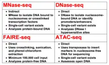 MNase-seq is one of four major methods (DNase-seq, MNase-seq, FAIRE-seq, and ATAC-seq) for more direct determination of chromatin accessibility and the subsequent consequences for gene expression.[52] All four techniques are contrasted with ChIP-seq, which relies on the inference that certain marks on histone tails are indicative of gene activation or repression,[53] not directly assessing nucleosome positioning, but instead being valuable for the assessment of histone modifier enzymatic function.[4]