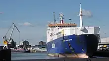 After the war Nordic Ferry continued on the Felixstowe–Europoort route.[16] In 1985–86 she underwent a £5 million refit at the Wilton-Fijenoord shipyard in Schiedam, the Netherlands, to fit her for combined passenger and freight use.[17][18][16] She had 27 additional cabins installed, bringing her passenger capacity up to 124. Nordic Ferry afterwards replaced MS Super Viking on the Felixstowe–Zeebrugge route.[18][16] She was assessed at 18,732 GRT, 10,578 NRT, 8,704 DWT.[1] Townsend Thoresen was rebranded as P&O European Ferries in 1987.[19] On 4 February 1987,[1] Nordic Ferry collided with the vessel San Salvador while travelling towards Felixstowe. The subsequent investigation found that San Salvador had proceeded at an unsafe speed of 6.5 knots (12.0 km/h; 7.5 mph) given she had an inoperable radar and visibility of only 50 feet (15 m) in poor weather. Although Nordic Ferry was proceeding faster, at 7–8 knots (13–15 km/h; 8.1–9.2 mph), her speed was ruled safe given she was fitted with two excellent radar sets, had a high level of manoeuvrability and an experienced crew.[20] Nordic Ferry was renamed Pride of Flanders by 1993 and in November 1995 was refitted at Harland and Wolff in Belfast to maximise her freight capacity.[16][21][22] Following the refit, she was assessed at 16,776 GT, 8,704 DWT. Her beam and depth were now 23.50 metres (77 ft 1 in) and 7.27 metres (23 ft 10 in) respectively.[1]
