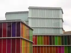 The MUSAC building is celebrated for its avant-garde architecture, and it has been awarded a number of prizes, such as the 2007 European Union Prize for Contemporary Architecture (Mies van der Rohe award).[6] Designed by the architectural studio of Luis M. Mansilla and Emilio Tuñón (Mansilla+Tuñón Arquitectos), the multicolored panels that adorn the exterior of the museum resemble the stained-glass windows of a cathedral. The architects drew their inspiration for this work from the main rose window (called The Falconer) at the local 13th century Gothic cathedral, Santa María de León.[1]
