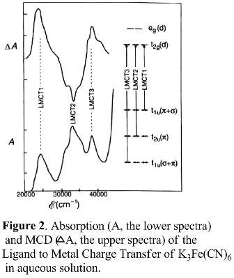 In the visible and near-ultraviolet regions, the hexacyanoferrate(III) ion (Fe(CN)63−) exhibits three strong absorptions at 24500, 32700, and 40500 cm−1, which have been ascribed to ligand to metal charge transfer (LMCT) transitions. They all have lower energy than the lowest-energy intense band for the Fe(II) complex Fe(CN)62− found at 46000 cm−1.[13] The red shift with increasing oxidation state of the metal is characteristic of LMCT bands. Additionally, only A terms, which are temperature independent, should be involved in MCD structure for closed-shell species.