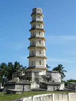 The word Manora is believed to be derived from the word minar meaning tower. The fort is hexagonal structure and has eight storeys, raising to a height of 75 ft (23 m) tapering to its top. The tower is surrounded by a wall and a moat ant it resembles a fort. The monument looks like a pagoda, with arched windows, circular staircase and eaves separating one storey from the other.