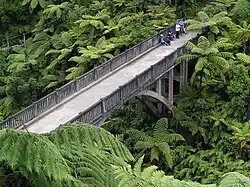 The Bridge to Nowhere is a concrete road bridge spanning the Mangapurua Stream in Whanganui National Park, North Island, New Zealand. It has no roads leading to it, but it is a popular tourist attraction, accessible by mountain bike or tramping on a variety of different tracks, or by boat or kayak, followed by a 45-minute (one way) walk along maintained bush trails.[1][2][3][4]