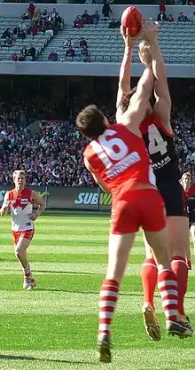 At a meeting of the Australasian Football Council (AFC) in 1890 a motion was passed banning pushing in the back in a marking contest which was agreed to by its member leagues including Victoria.[13] It was adopted by the newly formed VFL in 1897. While the rule encouraged high marking, players marking from behind were still often penalised.