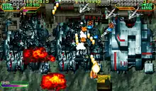 - Boss: An armored train of 5 cars. 3 cars have a gatling cannon and two doors that bring out turrets, mines, and fighters. The fourth car has several turrets. Inside is a legless mech with two chain guns. The last car is the engine car with arms with bazookas that shoot dozens of electric missiles.