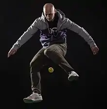 Martin Sladek performing Double Leg Over footbag trick in atelier