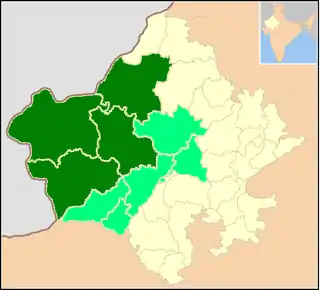 ![]() Dark green indicates Marwari speaking home area in Rajasthan, light green indicates additional dialect areas where speakers identify their language as Marwari. | |