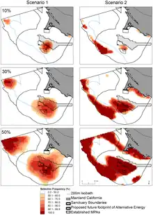 Marxan with Probability (MarProb) is Marxan with an additional objective function term that incorporates the probability of a site being destroyed at some point in the future. This function helps plan for persistence in protected area networks (see Game et al. 2008[32]). Some examples where it has been used includes planning for Iberian herptile conservation while accounting for uncertainty in their predicted distributions due to climate change,[33] and accounting for the inherent uncertainty associated with coral reef habitat maps in conservation planning, in the Kubulau District fisheries management area, Fiji.[34]