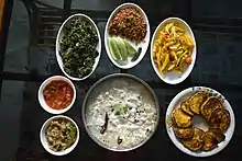 Odia cuisine is the cuisine of the Indian state of Odisha. Compared to other regional Indian cuisines, Odia cuisine uses less oil and is less spicy, while nonetheless remaining flavourful.[1] Rice is the staple food of this region. Mustard oil is used in some dishes as the cooking medium, but ghee (made of cow's milk) is preferred in temples. Odia foods traditionally served either on brass, bronze metal plates, banana leaf or disposable plates made of sal leaves.[2]