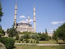 The Selimiye Mosque in Edirne, Turkey, was built by Mimar Sinan to provide a space where the mihrab could be seen from anywhere inside the building. The very large central space is accordingly arranged as an octagon, formed by eight enormous pillars, and capped by a circular dome of 31.25 metres (102.5 ft) diameter and 43 metres (141 ft) high. The octagon is formed into a square with four semidomes, and externally by four exceptionally tall minarets, 83 metres (272 ft) tall. The building's plan is thus a circle, inside an octagon, inside a square.[74]