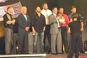 Morgan then teamed up with Hernandez and D'Angelo Dinero and moved on to feuding with Rhino and Team 3D, who accused TNA of favoring the younger talent of the company.[48] At Turning Point, Rhino and Team 3D defeated Morgan, Hernandez and Dinero in a street fight.[49] The next night, the two teams had a re-match which ended the same way after Jesse Neal returned and attacked Hernandez with a steel chair. It was announced that the two teams would face of at Final Resolution in an elimination match, but both teams were required to have four members. Team 3D immediately enlisted Neal, while Dinero pursued Suicide's help. Both teams fought in a regular tag match to determine an additional stipulation on the forthcoming match at Final Resolution. The match at Final Resolution would begin as a 4-on-1 handicap match, but if the disadvantaged wrestler survived the first 5 minutes his partners would then join the match, turning it into an eight-man elimination tag team match. Neal pinned Hernandez, meaning that Hernandez and his team would be disadvantaged at Final Resolution. At the pay-per-view Morgan, Hernandez (who survived), Dinero and Suicide defeated Jesse Neal, Team 3D and Rhino, with Morgan scoring the deciding fall on Brother Ray.[50]