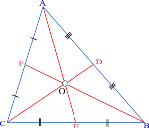 Consider a triangle ABC. Let D be the midpoint of , E be the midpoint of , F be the midpoint of , and O be the centroid (most commonly denoted G).