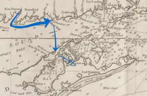 An opportunity arose when they learned that a British foraging expedition had landed at Sag Harbor, Long Island. Sag Harbor had been occupied by British troops after the August 1776 Battle of Long Island, and they had established a strong defensive position on Meeting House Hill, with earthwork fortifications and palisades.[7] The town was well-situated for providing supplies to the Royal Navy, which used Gardiner's Bay as an anchorage while patrolling the eastern end of Long Island Sound.[8] The forage expedition consisted of 12 smaller boats protected by a schooner mounting 12 guns; the small boats were manned by crews totaling about 40 men. Sag Harbor was at the time garrisoned by 70 men from the Loyalist battalion of Lieutenant Colonel Stephen De Lancey.[9] The detachment was under the command of Captain James Raymond.[10]