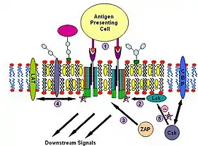 T cell antigen receptor (TCR) is a molecule found on the surface of T lymphocytes (T cells). It is composed of αβ-heterodimers, CD3 (γδε) complex and ξ-homodimer. The α- and β- subunits contains extracellular binding sites for peptides that are presented by the major histocompatibility complex (MHC) class I and class II proteins on the surface of antigen presenting cells (APCs). The CD3 and ξ- subunits contain cytoplasmic ITAM motifs. During the signaling process, MHCs binding to TCRs brings two or more receptors together. This crosslinking, similar to IgE signaling, then recruit doubly acylated non-receptor Src-like tyrosine kinases to phosphorylate ITAM tyrosine residues. In addition to recruiting Lyn, TCR signaling also recruits Fyn.[25][45] Following this procedure, ZAP-70 (which is also different with IgE signalling) binds to phosphorylated ITAMs, which leads to its own activation and LAT activation. LAT activation is the source of signal amplification. Another difference between IgE and T cell antigen receptor signalling is that Lck activation by TCR could result in more severe raft clustering[46][47] thus more signal amplification. One possible mechanism of down-regulating this signaling involves the binding of cytosolic kinase Csk to the raft associated protein CBP. Csk may then suppress the Src-family kinases through phosphorylation.[48]
