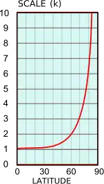 - at latitude 60° the scale factor is k = sec 60° = 2,