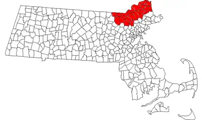The Merrimack Valley area in Massachusetts is a community of towns and cities flanking the Merrimack River along the New Hampshire border, a portion of which is defined by a line approximately 3 miles (5 km) north and west of the Merrimack. The cities (marked with italics) and towns in this area are:[1][2]