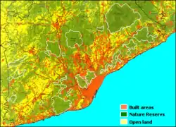 According to the EURBANET project by Delft University of Technology[10] it speaks about polynuclear urban region when there exists a series of important urban centers that relate intensely among them and to the exterior. This one is the case of bordering zones to the urban region that they extend around the cities of Tarragona and Girona. They are areas with a great economic dependence and services to the capital. They are narrow corridors well communicated to Barcelona, both by highway and railroad, which there fuse the metropolitan areas of these cities with the urban region. The PUR of Barcelona comprises 6,103,221 people in an area of 6,005 km2.