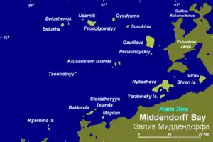 The Middendorff Bay is surrounded by bleak tundra coast. It is full of small islands and island groups, foremost of which are Gavrilova Island, the Shren Islands, the Krusenstern Islands, and farther offshore, Belukha and Prodolgovatyy Islands. The small Myachina Islands are located 3 km (1.9 mi) off Cape Vilda, further west from the bay along the coast.[1]