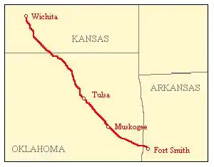 The Midland Valley Railroad (MV) was a railroad company incorporated on June 4, 1903 for the purpose of building a line from Hope, Arkansas, through Muskogee and Tulsa, Oklahoma to Wichita, Kansas. It was backed by C. Jared Ingersoll, a Philadelphia industrialist who owned coal mining properties in Indian Territory (now part of the state of Oklahoma).[1] The railroad took its name from Midland, Arkansas, a coal mining town in western Arkansas, which was served by the railroad.[lower-alpha 1] The Midland Valley gained access to Fort Smith, Arkansas via trackage rights over the Frisco from Rock Island, Oklahoma.