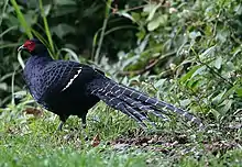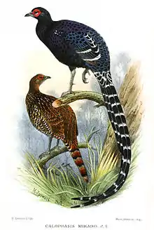 The Mikado pheasant (Syrmaticus mikado) is a gamebird in the pheasant family Phasianidae of the order Galliformes, gallinaceous birds. Sometimes considered an unofficial national bird of Taiwan (along with the Swinhoe's pheasant and Taiwan blue magpie), a pair of Mikado pheasants and Yushan National Park, one of the areas it is known to inhabit, is depicted in the 1000 dollar bill of the New Taiwan dollar. [3]
