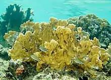 Fire corals are colonial coral-like organisms that secrete calcareous skeletons.[3] Colonies of Millepora complanata have an encrusting base and thin upright plates or blades growing to a height of about 50 centimetres (20 in). The plates of Millepora complanata grow perpendicular to the current direction, with some colonies not growing larger than the encrusted base if the current is too strong.[4] The surface of the blades is smooth and the outer margins irregular, with many stumpy protrusions. This fire coral is pale brown or cream coloured, with white tips to the blades. The feeding and defensive polyps are hair-like and project through fine pores on the surface of the blades. Contact with this fire coral by bare skin can cause a severe stinging sensation.[5]