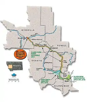 Since 1992, the site has been a part of the Clark Fork River Superfund Complex, consisting of three major sites (the other two in Anaconda and Butte) along a 120-mile stretch of the Clark Fork River. The Complex is the largest and most expensive Superfund site in the United States.[2]