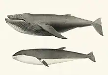 The minke whale (/ˈmɪnki/), or lesser rorqual, is a species complex of baleen whale.[1] The two species of minke whale are the common (or northern) minke whale and the Antarctic (or southern) minke whale.[2] The minke whale was first described by the Danish naturalist Otto Fabricius in 1780, who assumed it must be an already known species and assigned his specimen to Balaena rostrata, a name given to the northern bottlenose whale by Otto Friedrich Müller in 1776.[3] In 1804, Bernard Germain de Lacépède described a juvenile specimen of Balaenoptera acuto-rostrata.[4] The name is a partial translation of Norwegian minkehval, possibly after a Norwegian whaler named Meincke, who mistook a northern minke whale for a blue whale.[5]