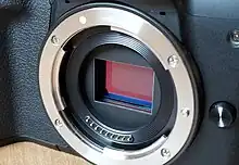 In cameras with mirrors, light from the lens is directed to either the image sensor or the viewfinder. This is done using a mechanical movable mirror which sits behind the lens.[6] By contrast, in a mirrorless camera, the lens always shines light onto the image sensor, and what the camera sees is displayed on a screen for the photographer. Some mirrorless cameras also simulate a traditional viewfinder using a small screen, known as an electronic viewfinder.[5]