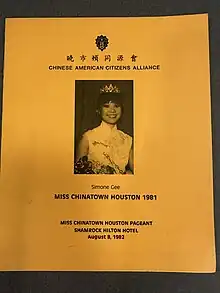 Miss Chinatown Houston was a beauty pageant founded by the Chinese American Citizens Alliance Houston chapter with the first pageant being held in 1971 in La Porte, Texas.[1] Miss Chinatown Houston is part of the greater Miss Chinatown USA pageants, the first of which was held in San Francsico, where the first Chinatown was established.