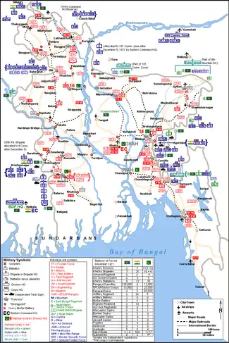 The Indian Army Eastern Command assembled two existing infantry corps, the IV Corps and the XXXIII Corps, for operations in Bangladesh, and created a new corps (II Corps)[2] besides reorganising the 101 Communication Zone as a combat formation.[3] On 21 November 1971, the Indian and Bangladesh forces were put under a joint command structure India Bangladesh force in the eastern theatre, led by Lieutenant General Jagjit Singh Aurora, and this force came to be known as Mitro Bahini. In addition to 29 battalions of the Border Security Force (BSF),[4] Mukti Bahini guerrillas operating near the border or awaiting deployment in camps inside India were organised into infantry companies and attached to various Indian formations.