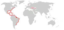 Worldwide distribution of Mnemiopsis leidyi. Native range in red, colonized areas in pink