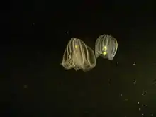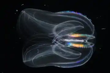 Mnemiopsis leidyi, the warty comb jelly or sea walnut,[1] is a species of tentaculate ctenophore (comb jelly). It is native to western Atlantic coastal waters, but has become established as an invasive species in European and western Asian regions. Three species have been named in the genus Mnemiopsis, but they are now believed to be different ecological forms of a single species M. leidyi by most zoologists.[2]