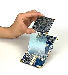 The prototype boards shown to date include a x86-compliant 1 GHz VIA C7-M processor, 256 or 512 megabytes of RAM, a modified version of the VIA CX700 chipset (called the CX700S),[3] an interface for a cellular radio module (demonstration boards contain a CDMA radio), a DC-DC electrical converter, and various connecting interfaces.