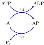 The presence of conserved moieties can affect how computer simulation models are constructed.[7][8] Moiety-conserved cycles will reduce the number of differential equations required to solve a system. For example, a simple cycle has only one independent variable. The other variable can be computed using the difference between the total mass and the independent variable. The set of differential equations for the two-cycle is given by: