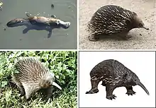 | Four of the five extant monotreme species: platypus (top-left), short-beaked echidna (top-right), western long-beaked echidna (bottom-left), and replica eastern long-beaked echidna (bottom-right) | |
