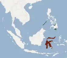 It is native to Southeast Asia where it is found in Indonesia and the Philippines. It has been found at elevations up to 1,000 m (3,300 ft) above sea level.[1]