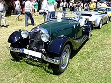Morgan's racing programme in 1927 earned the marque eleven gold medals and three silvers from fourteen entrants at MCC's London-Edinburgh Trials alone.[30] The team was joined by Clive Lones and C. T. Jay, who won the 1929 Cyclecar Grand Prix at Brooklands, driving a 750 cc (46 cu in) Morgan-JAP, with an average speed of 64.7 mph (104.1 km/h).[32] And in 1930, Gwenda Stewart turned in a speed of 113 mph (182 km/h) in a race-tuned Super Sports.[32]